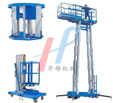 鋁合金升降機(jī)大致分為單桅升降機(jī)、雙桅升降機(jī)、三桅升降機(jī)和多桅升降機(jī)。鋁合金升降機(jī)采用高強(qiáng)度優(yōu)質(zhì)鋁合金材料,具有造型美觀、體積小、重量輕、運(yùn)轉(zhuǎn)靈活,推行方便,升降平穩(wěn)、安全可靠等優(yōu)點(diǎn),它輕盈的外觀能在極小的空間內(nèi)發(fā)揮最高的舉升能力。廣泛用于工廠、賓館、餐廳、車(chē)站、影劇院、展覽館等場(chǎng)所,是保養(yǎng)機(jī)具、油漆裝修、調(diào)換燈具、電器、清潔保養(yǎng)等用途的最佳安全伴侶。